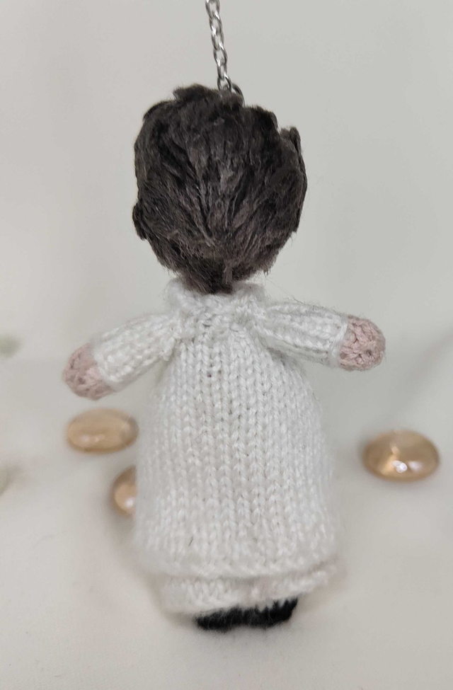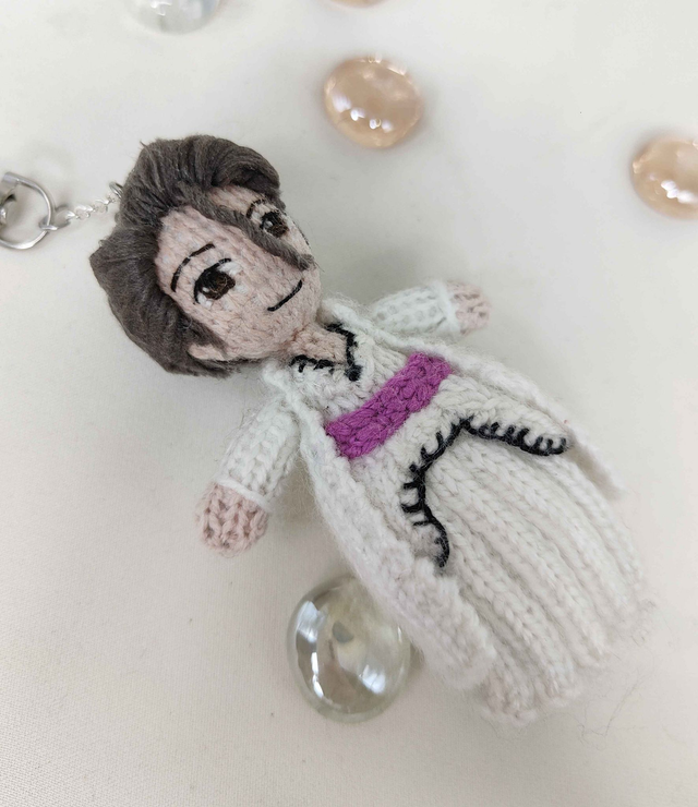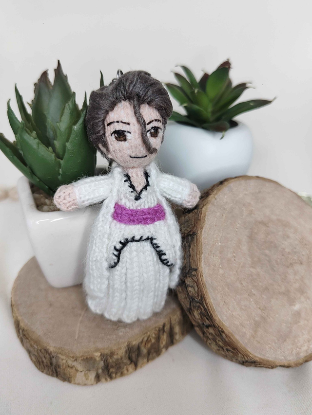 This handmade knitted mini art doll, inspired by Sousuke Aizen (Bleach), is designed as a tiny companion to adopt or gift. It can be displayed as decoration, hung up, or attached to a bag or pouch.