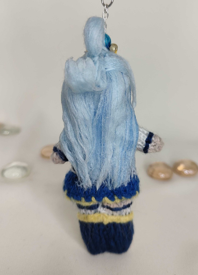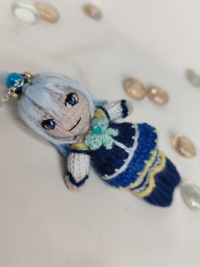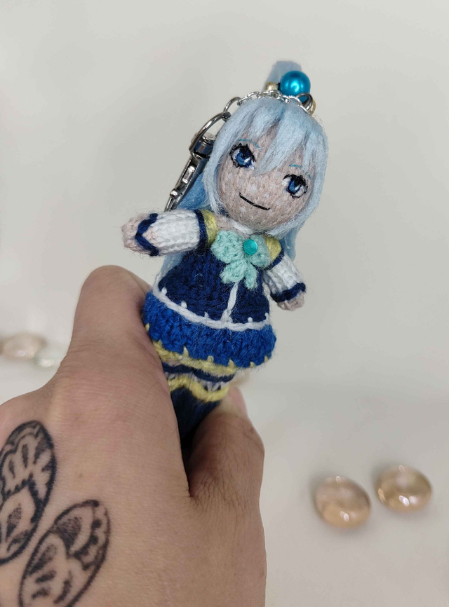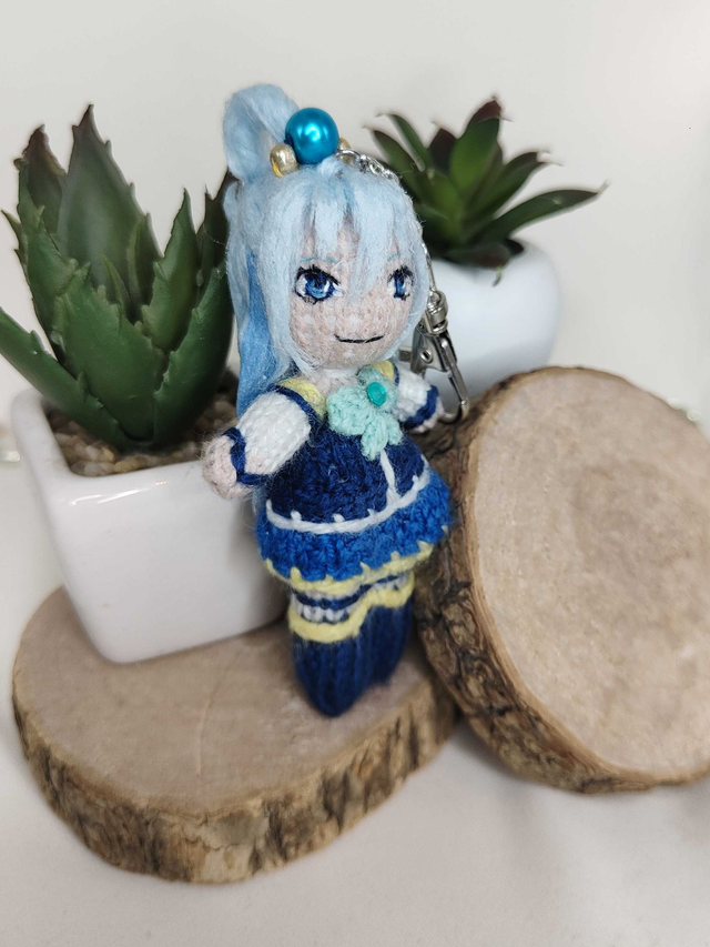 This handmade knitted mini art doll, inspired by Aqua (Konosuba), is designed as a tiny companion to adopt or gift. It can be displayed as decoration, hung up, or attached to a bag or pouch.