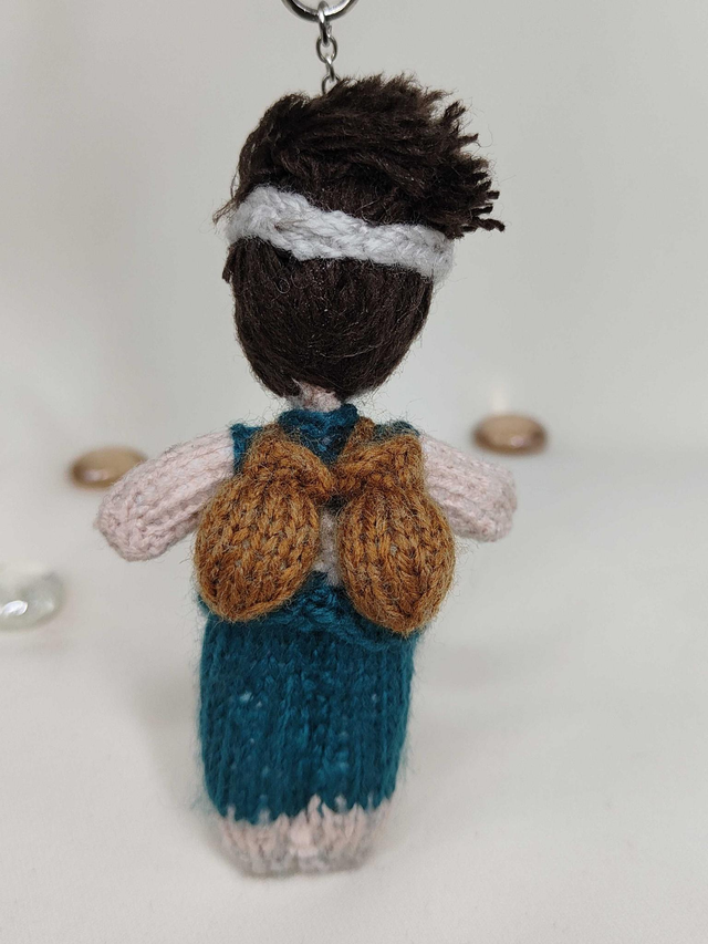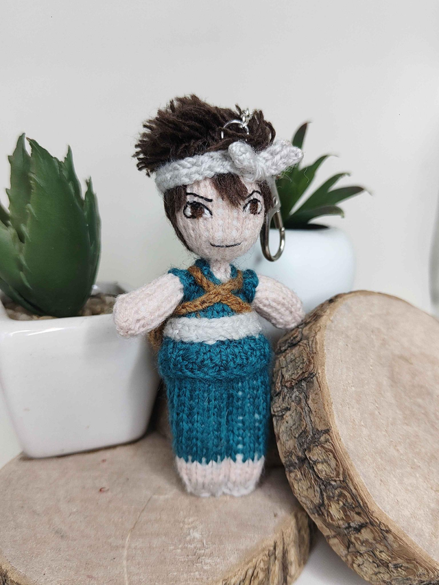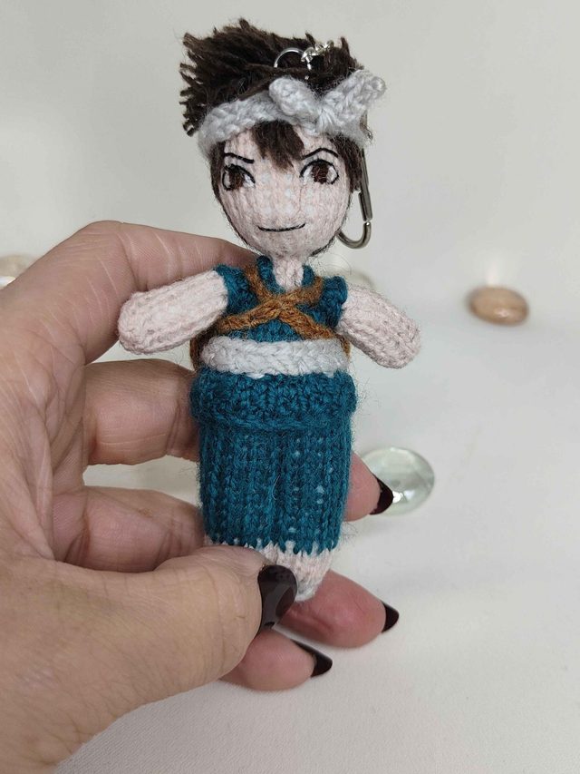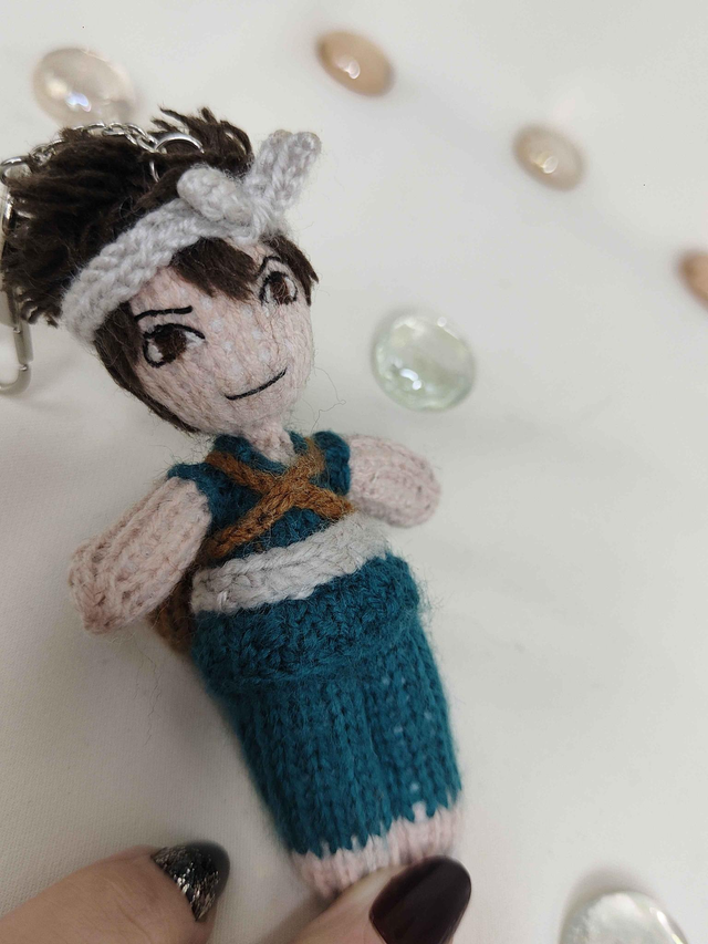 This handmade knitted mini art doll, inspired by Chrome (Dr Stone), is designed as a tiny companion to adopt or gift. It can be displayed as decoration, hung up, or attached to a bag or pouch.
