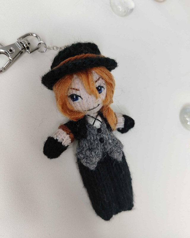 This handmade knitted mini art doll, inspired by Chuuya Nakahara (Bungo Stray Dogs), is designed as a tiny companion to adopt or gift. It can be displayed as decoration, hung up, or attached to a bag or pouch.