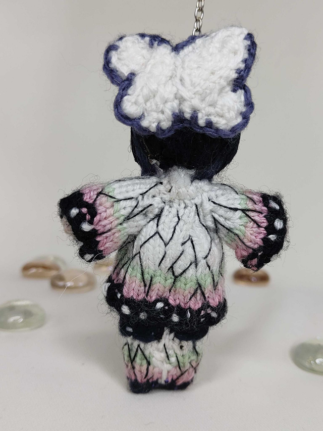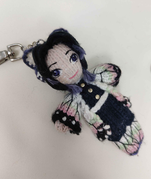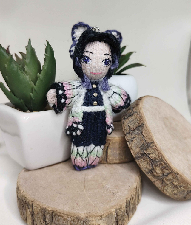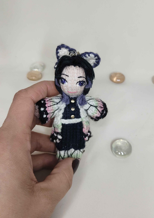 This handmade knitted mini art doll, inspired by Shinobu Kocho (Demon Slayer / Kimetsu no Yaiba), is designed as a tiny companion to adopt or gift. It can be displayed as decoration, hung up, or attached to a bag or pouch.